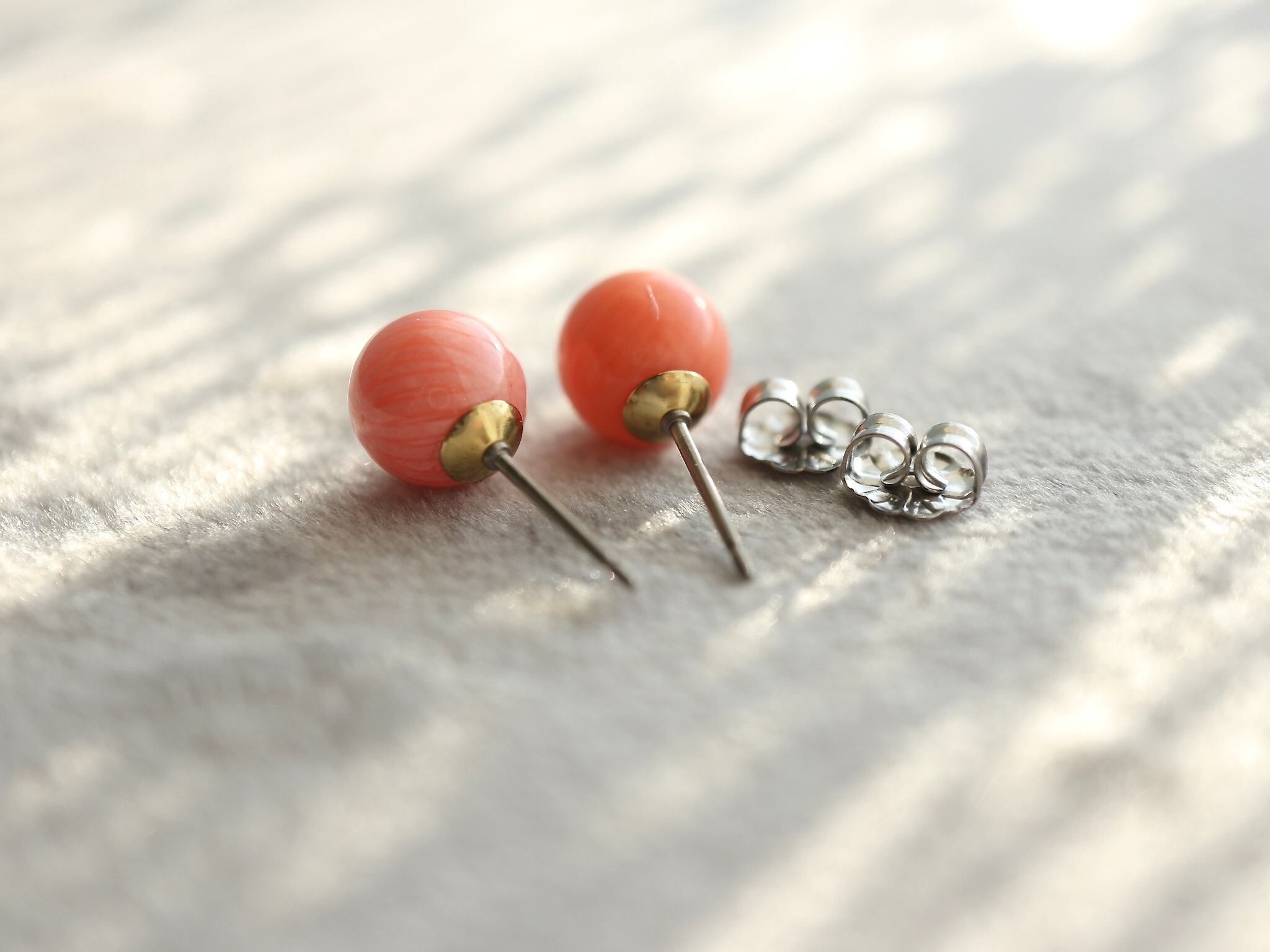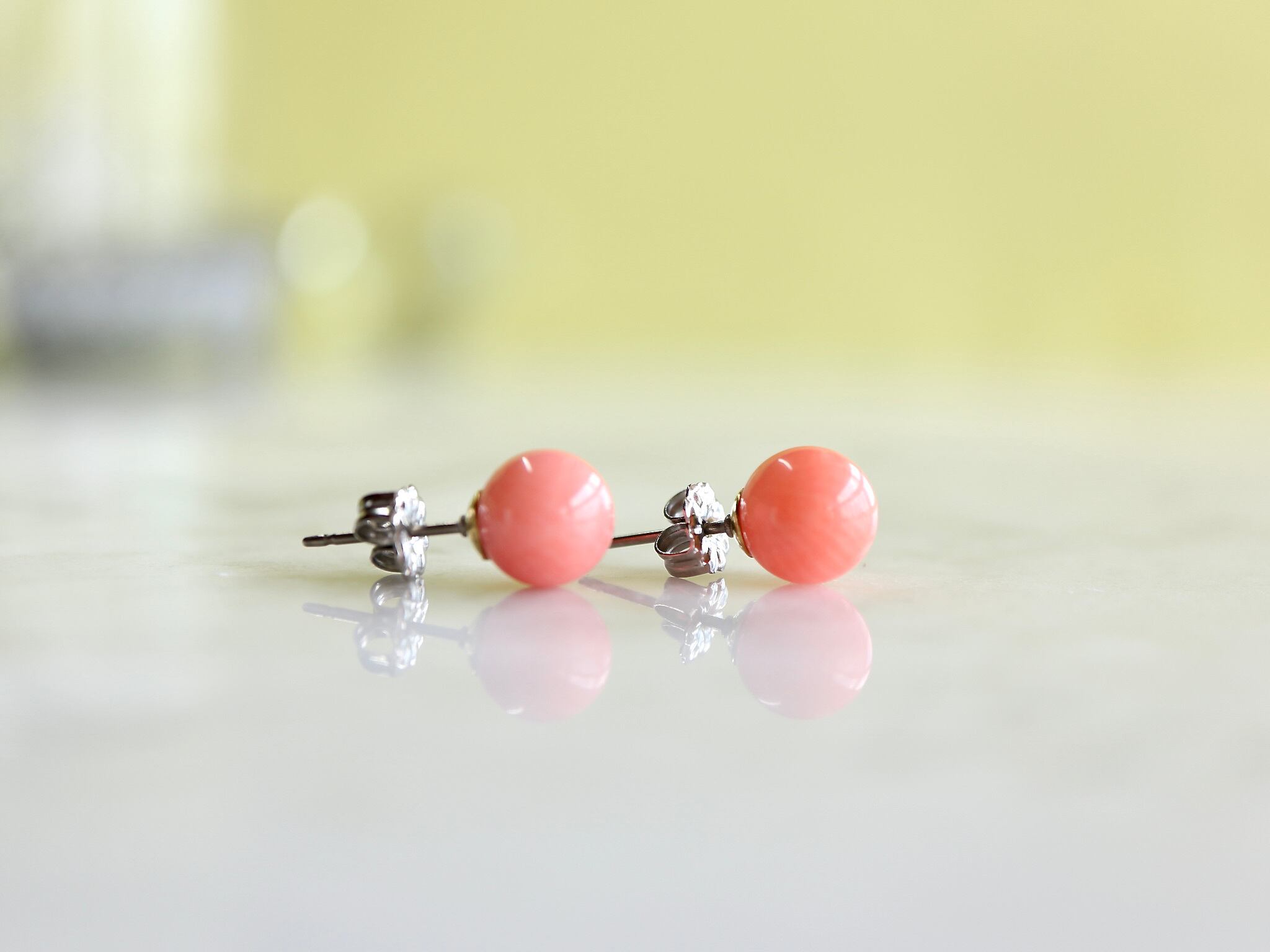 インドネシア産の天然白珊瑚をピンクオレンジへ染め加工を施した8mmサイズの珊瑚(コーラル)ピアス。 お皿部分は真鍮、ピアスポスト部分とキャッチはステンレスよりもさらにアレルギー対策に強いチタンの材質になります。